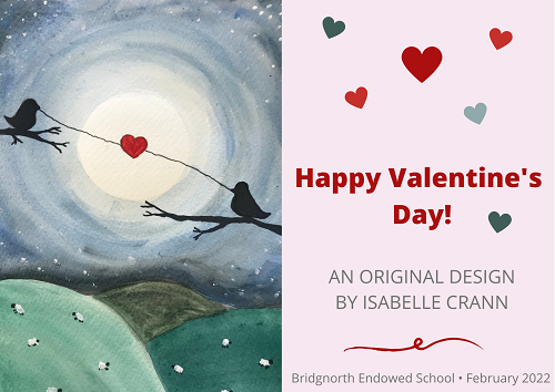 The winner of this year’s Bridgnorth Endowed Valentine’s Card Competition has been announced as Isabelle Crann from Year 7, for her beautifully hand-painted ‘lovebirds by moonlight’ design. Freya Southall (7SC) came second with her highly topical ‘positively in love with you’ card, which featured a Covid lateral flow test, and Martha Bradburn (8IN) was given …